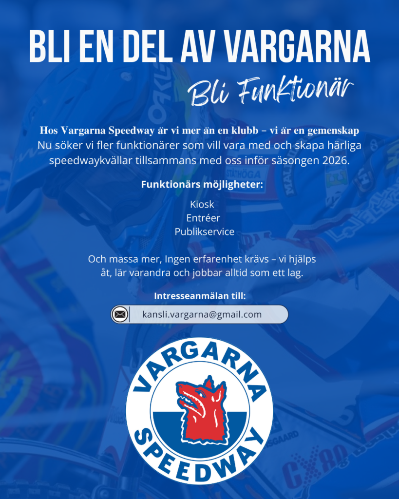 Nu söker vi fler funktionÀrer som vill vara med och skapa hÀrliga speedwaykvÀllar tillsammans med oss inför sÀsongen.
