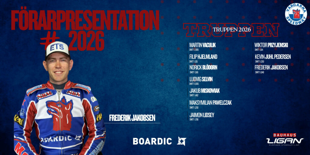 Sista föraren med ett snitt över 1,249 är klar. Vi välkomnar Frederik Jakobsen till Vargarna. Under årets säsong körde Fredrik Jakobsen för Dackarna. Där stod han för flera fina prestationer, var en av deras ledande förare och körde till sig näst högsta snittet i deras trupp. Vargarna blir Jakobsens tredje…